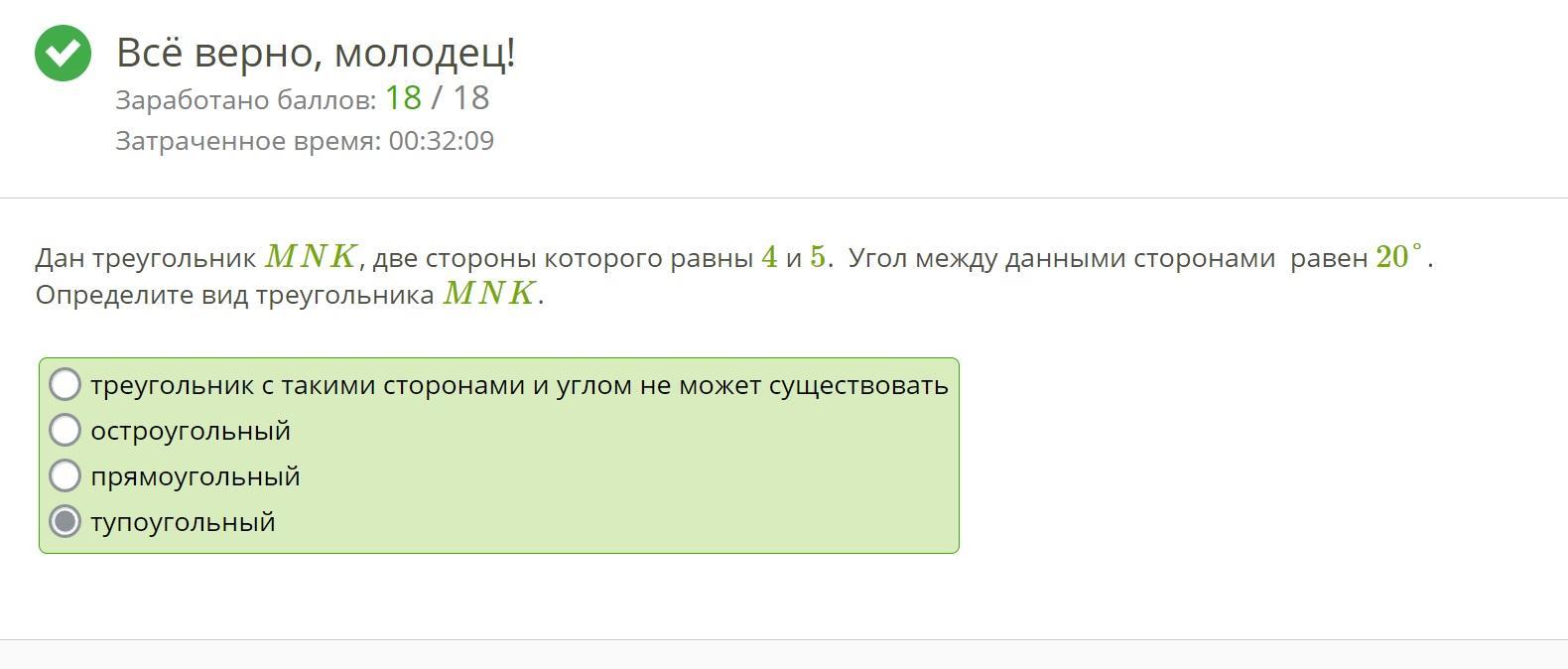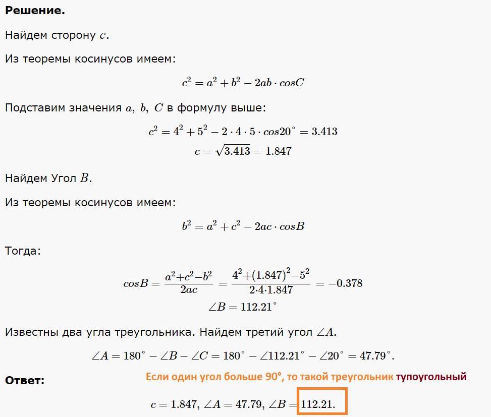 Две стороны треугольника равны 4 и 5, а угол между ними 20°. Определите вид треугольника.