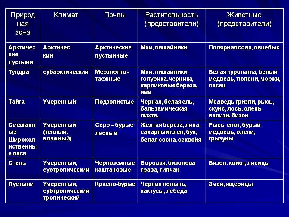 Составьте пожалуйста таблицу. 1)природная зона( название) 2)где расположена 3) климатические условия.4) животный мир 5) растительный мир