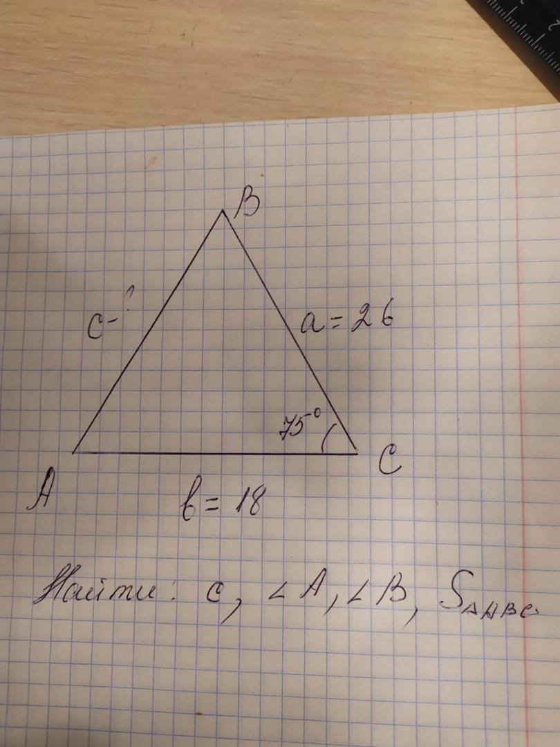 c=корень(a^2+b^2-2ab*cos75) = корень(26^2+18^2-2*26*18*0.25)=
