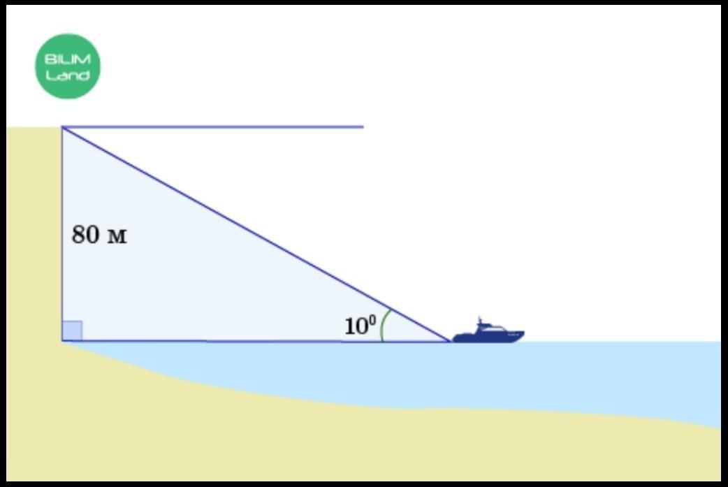 Высота вертикального обрыва 80 м над уровнем моря. Если с лодки вершина обрыва наблюдается под углом 10°, то найди расстояние между основанием обрыва и лодкой. Округли ответ до целых.
