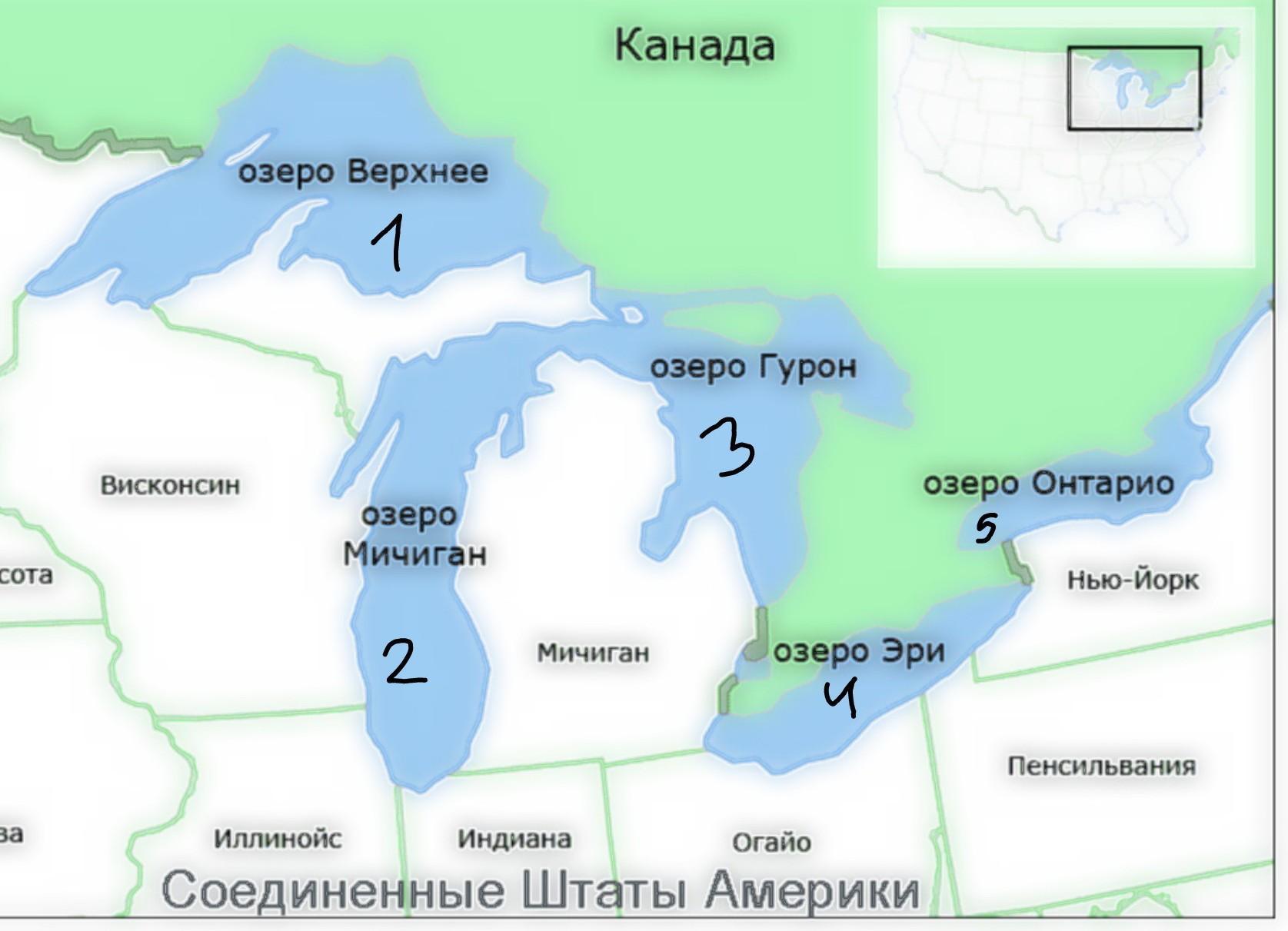 Отметьте на карте озера: Верхнее, Гурон, Мичиган, Эри, Онтарио.