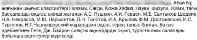 Абай бір жағынан шығыс классиктері Низами, Сағди, Қожа Хафиз, Науаи, Физули, Жәми, тағы басқаларды оқыса, екінші жаганан А.С. Пушкин, А.И. Герцен, М.Е. Салтыков-Щедрин, Н.А. Некрасов, М.Ю. Лермонтов, Л.Н. Толстой, И.А. Крылов, Ф.М. Достоевский, И.С. Тургенов, Н.Г.Чернышевский мұраларын оқып, терең таныс болған, Батыс әдебиетінен Гете, Дж. Байрон сияқты ақындарды оқып, түрлі ғылым салалары бойынша зерттеулер жүргізілді.