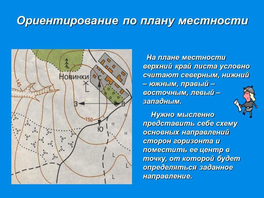 На плане местности стороны горизонта указывает стрелка, расположенная в верхнем левом углу. Если же на плане стрелка не указана, тогда верхний край плана принимают за север, нижнюю часть – за юг, левую – за запад, а правую – за восток. Зная эти направления, на плане местности можно определить направления на те объекты, которые там изображены.
