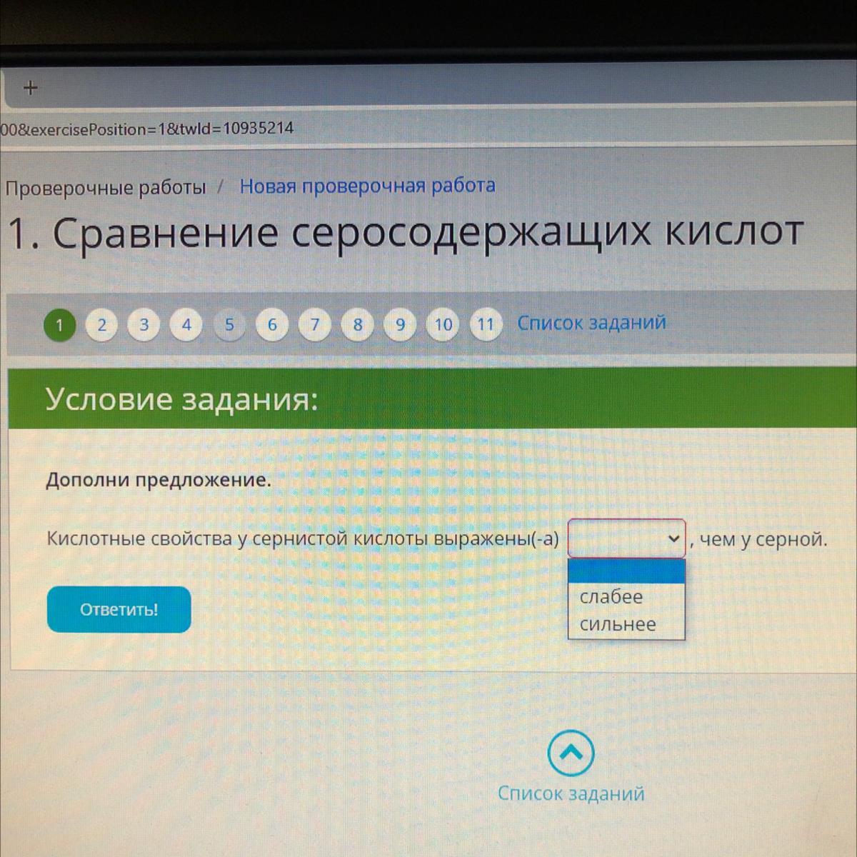 Кислотные свойства у сернистой кислоты выражены(-а) слабее/сильнее, чем у серной.