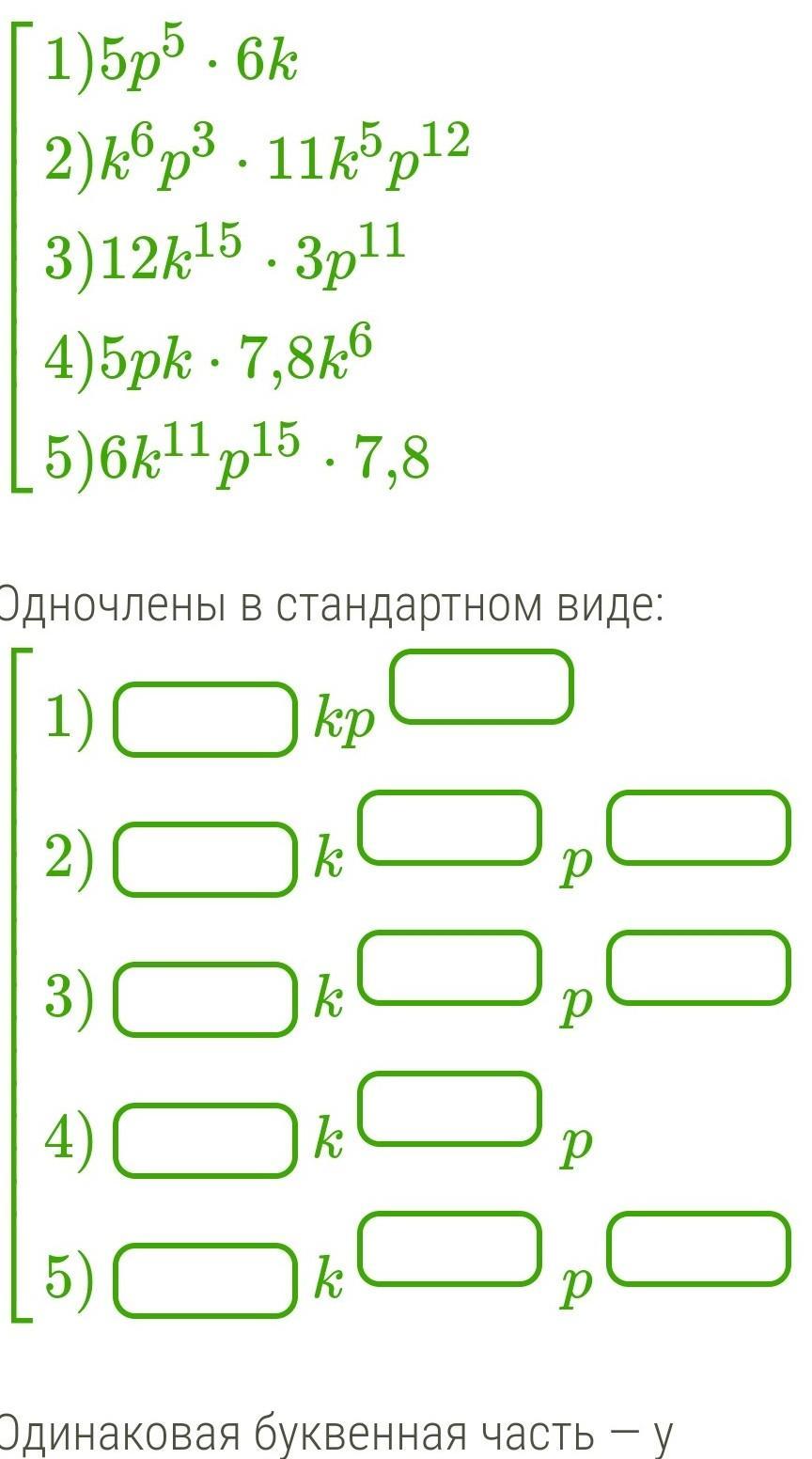 Запиши одночлены в стандартном виде и назови те, у которых одинаковая буквенная часть.