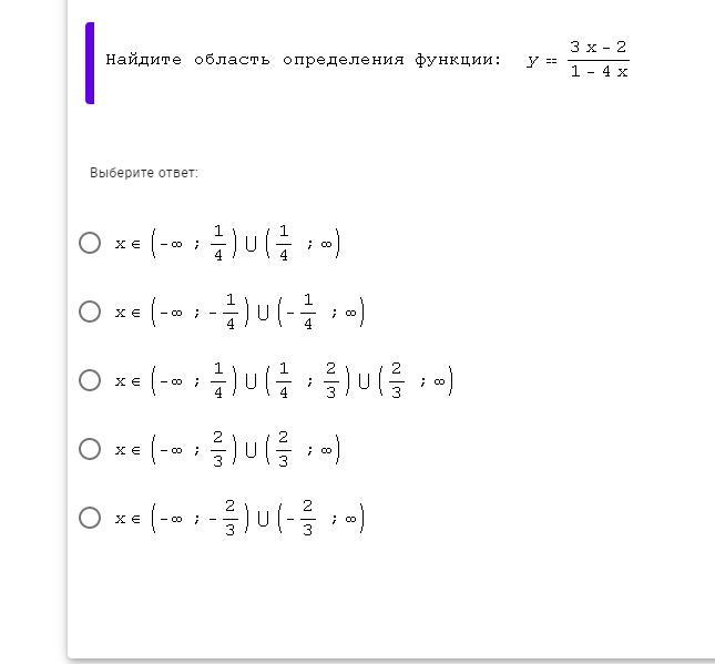 y=\frac{3x-2}{1-4x}\\\\1-4x\neq0\\\\-4x\neq -1\\\\x\neq\frac{1}{4}\\\\Otvet:\boxed{x\in(-\infty;\frac{1}{4})\cup(\frac{1}{4};+\infty)}