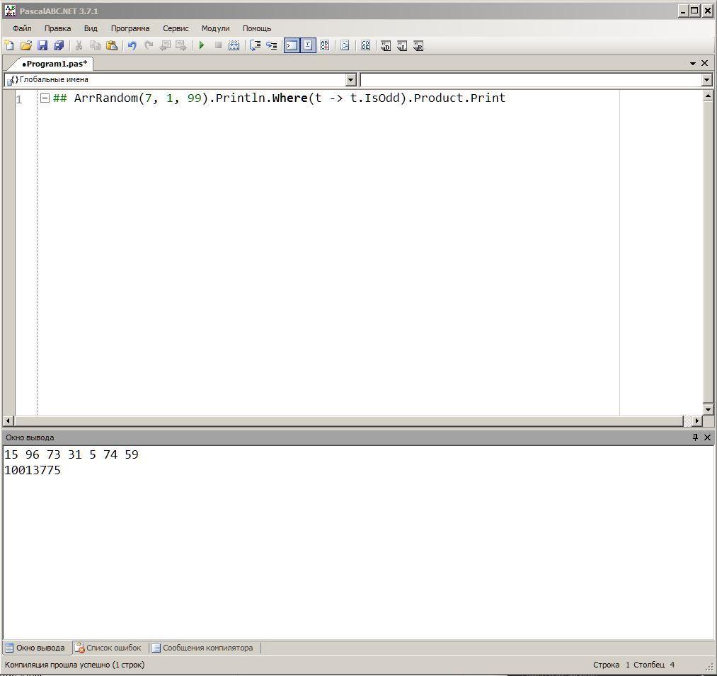 Написать программу по Паскалю.Дан одномерный массив из 7 элементов, заполненный случайным числом в интервале от 1 до 99. Напишите программу, которая находит произведение всех нечетных элементов массива. Значения элементов вывести в строку через пробел.