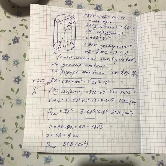 50 БАЛЛОВ. Решите задачу: диагональ осевого сечения цилиндра 36 см. Угол между диагональю сечения и образующей цилиндра равен 30°. Найдите радиус, высоту и площадь основания цилиндра.