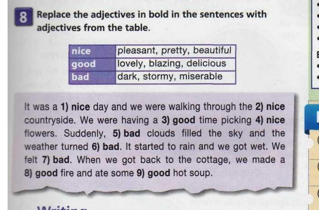 значит пиши так вместо 1 pleasant вместо 2 beautiful вместо 3 blazing вместо 4 pretty вместо 5 miserable вместо 6 dark вместо 7 stormy вместо 8 lovely вместо 9 delicious