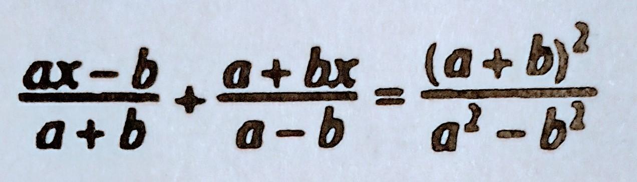 \dfrac{ax-b}{a+b}+\dfrac{a+bx}{a-b}=\dfrac{(ax-b)(a-b)+(a+bx)(a+b)}{(a+b)(a-b)}=\\\\\\=\dfrac{a^2x-abx-ab+b^2+a^2+ab+abx+b^2x}{a^2-b^2}=\dfrac{a^2x+b^2+a^2+b^2x}{a^2-b^2}=\\\\\\=\dfrac{x(a^2+b^2)+(a^2+b^2)}{a^2-b^2}=\dfrac{(a^2+b^2)(x+1)}{a^2-b^2}\ne \dfrac{(a+b)^2}{a^2-b^2}