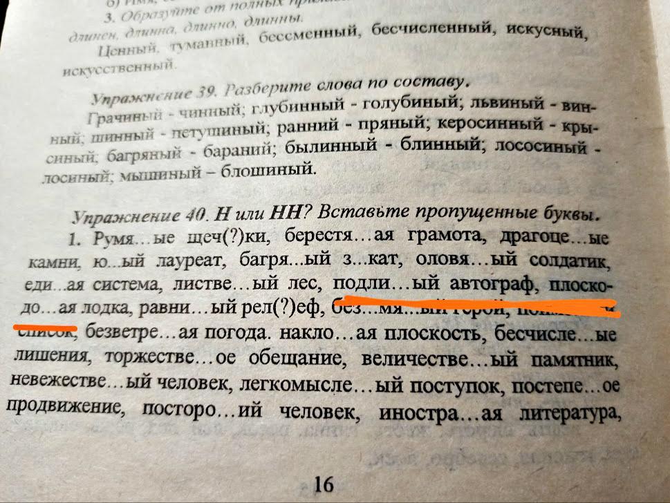 1. Румя.ые шеч(?)ки, берестяная грамота, драгоце…ые камни, ю…ый лауреат, багря…ый з…кат, оловя…ый солдатик, еди…ая система, листве…ый лес, подли.ый автограф, плоско- до…ая лодка, равни…ый рел(?)еф, без…мя… список, безветре…ая погода. накло…ая плоскость, бесчисле…ые лишения, торжестве…ое обещание, величестве…ый памятник, невежестве…ый человек, легкомысле…ый поступок, постепе…ое продвижение, посторо…ий человек, иностра.ая литература,