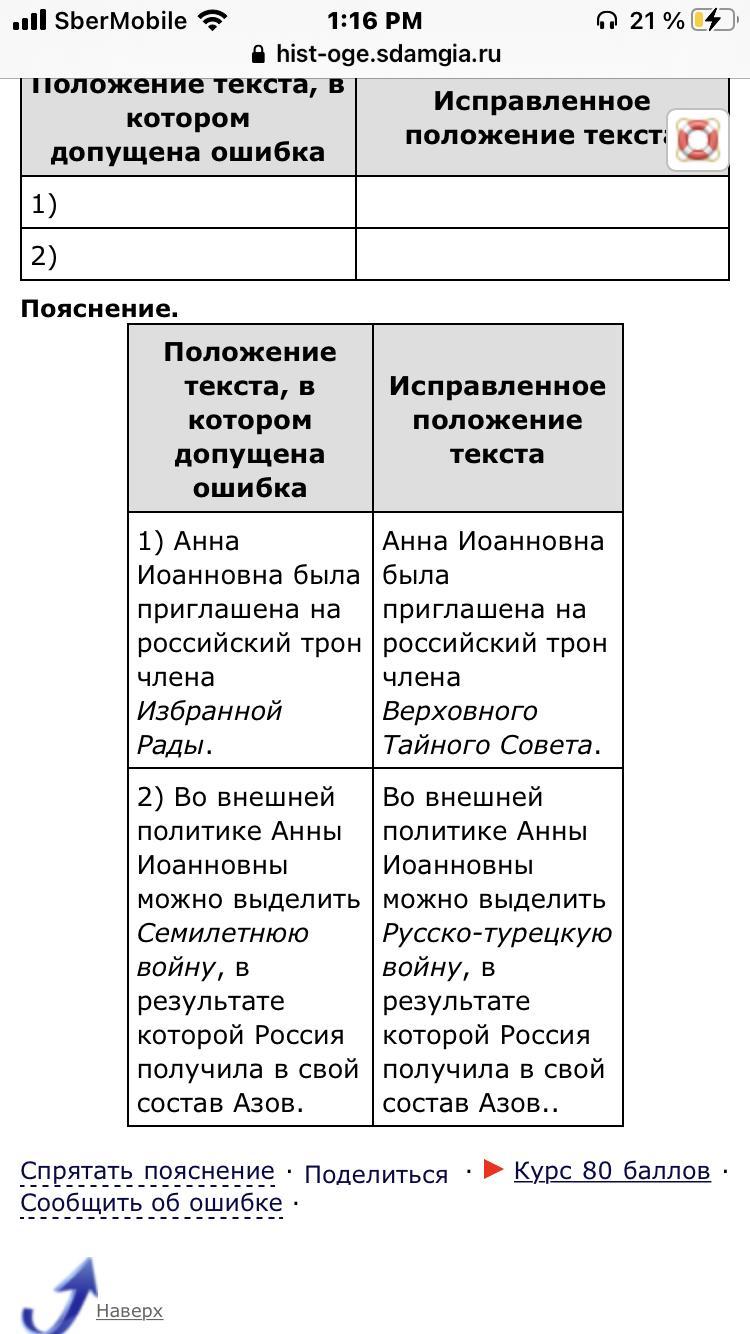 Задание 5. Прочитайте текст, который содержит две фактические ошибки. Найдите фактические ошибки и исправьте их. Ответ запишите в следующем формате: фрагмент текста, в котором допущена ошибка - исправленное положение текста. Анна Иоанновна была приглашена на российский трон членами Избранной Рады, которые предложили ей подписать кондиции. Приехав в Россию и получив поддержку дворян, Анна Иоанновна разорвала кондиции и стала править самовластно. Она проводила политику в интересах дворян, ограничила срок их службы, разрешила записывать детей в полки с младенчества, учредила Шляхетский корпус. Во внешней политике Анны Иоанновны можно выделить Семилетнюю войну, в результате которой Россия получила в свой состав Азов. *