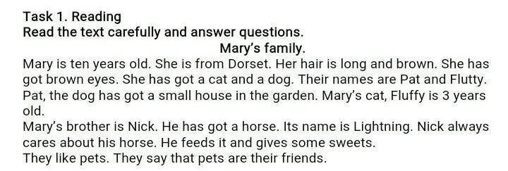 Мери 10 лет . Она из Дорсета. Ее волосы длинные и коричневые. У неё карие глаза. У неё есть кот и собака . Их зовут Пет и Флаффи. У собаки Пет есть маленький дом в саду. Коту Мери Флаффи 3 года . Брат Мери Ник . У него есть лошадь . Ее зовут Молния .Ник всегда зобатится о своей лошади . Он кормит и даёт своей лошади сладкое. Им нравятся животные .Они говорят, что их животные друзья. (Фух)