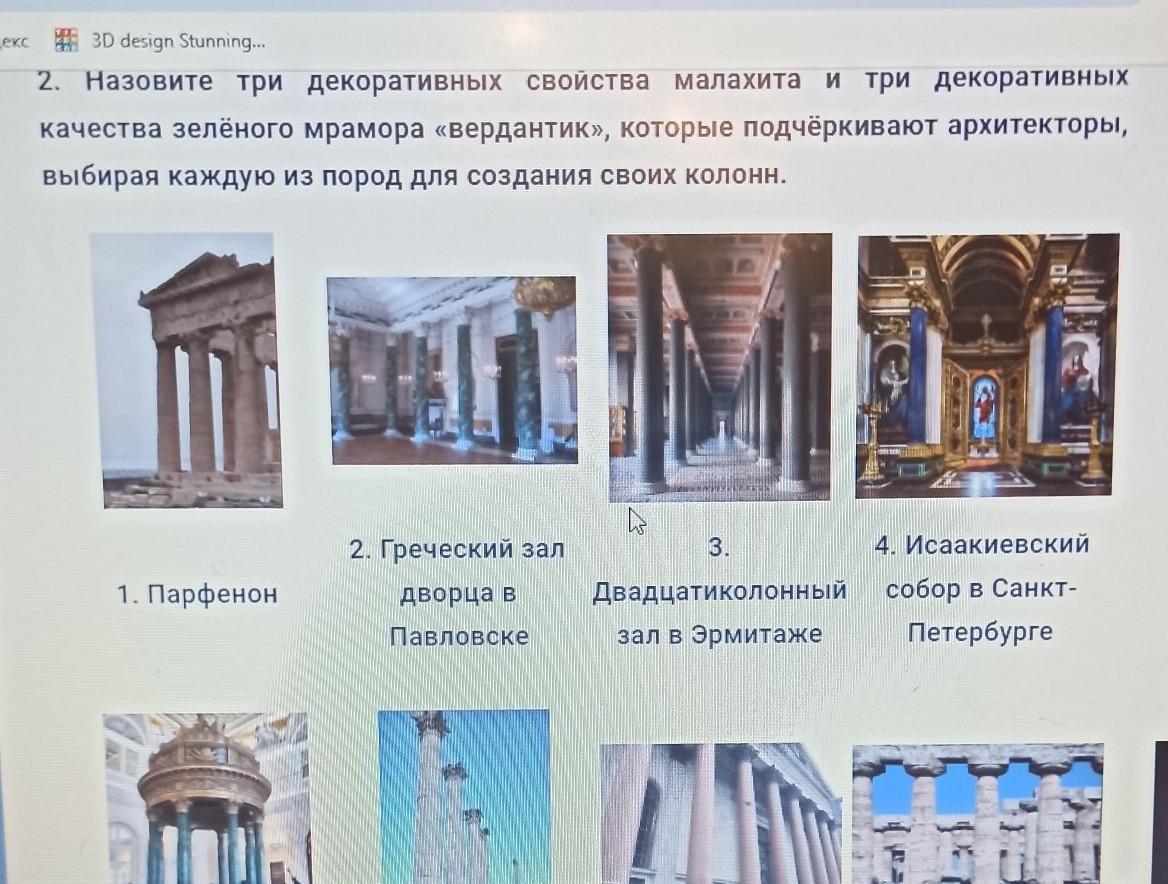назовите три декоративных свойства малахита и три декоративных качество зеленого мрамора Данте который подчеркивает архитектуры выбирая каждую из породы для создания своих колонн.