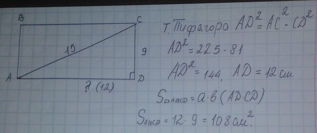 вторая сторона=корень из разности 15² и 9²=корень из 225-81=корень из 144=12