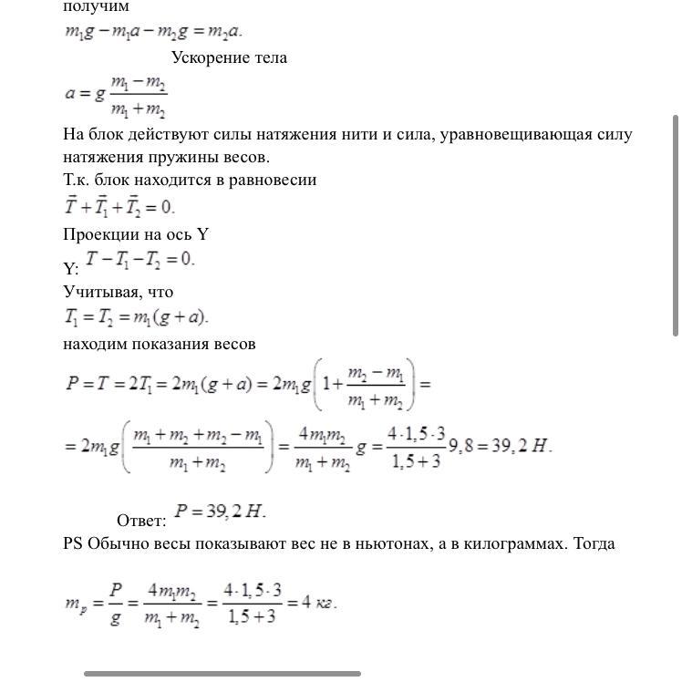 Каковы будут показания весов при движении грузов? Массами блока и шнура пренебречь.