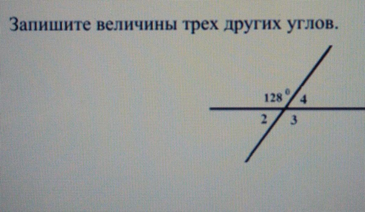 Предположу, что, используя свойство смежных углов, можно сделать вывод, что углы 2 и 4 = 52°, (180° - 128°). Ну и все по той же схеме определяем, что угол 3 = 128° (180°- 2 угол, 180° - 52°)