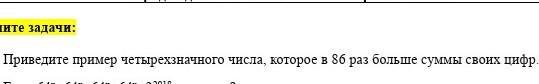 Приведите пример четырехзначного числа, которое в 86 раз больше суммы своих инфр. С решением !!!