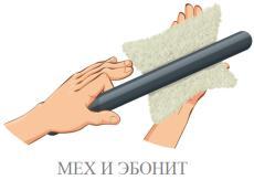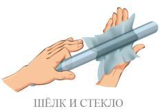 эбонитовая палочка, потёртая о мех стеклянная палочка, потёртая о шёлк