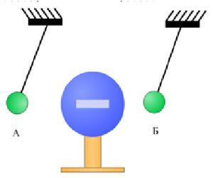 Заряд шарика А отрицательный,т.к он отталкивается от отрицательно зарядженого синего шара. Заряд шара Б положительный,т.к он притягивается к отрицательно заряженному синему шарику.