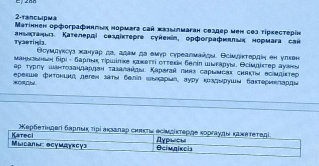 мәтіннен орфографиялық нормаға сай жазылмаған сөздер мен сөз тіркестерін анықтаңыз.Қателерді сөздіктерге сүйеніп орфографиялық нормаға сай түзетіңіз.