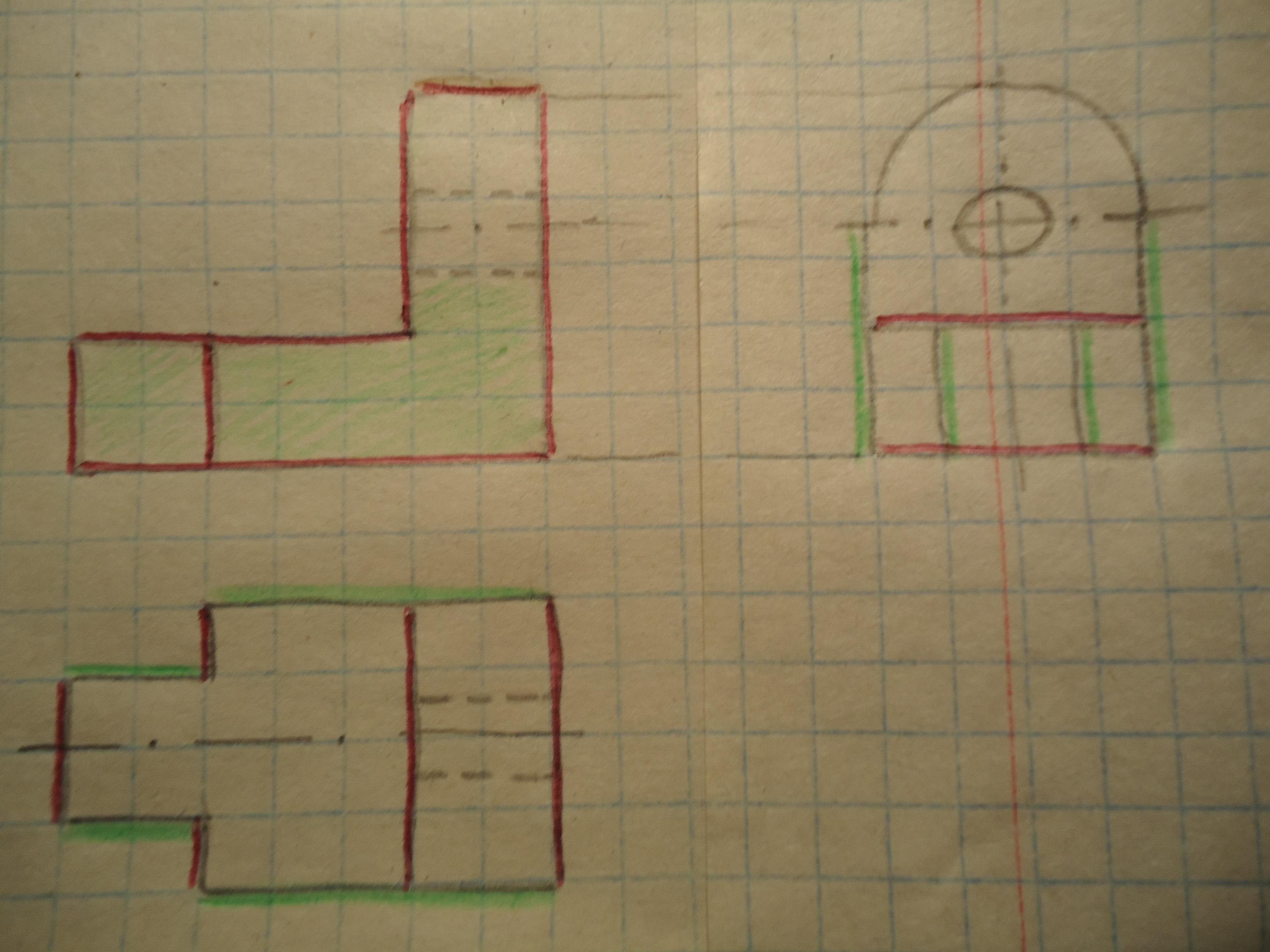Поверхности, перпендикулярные горизонтальной плоскости, отмечены зелёным цветом.