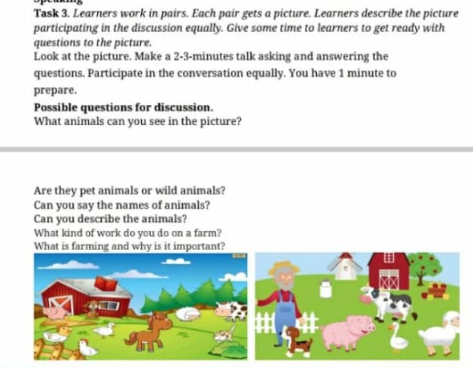Horse, cow, duck, sheep, chicken, dog, cat.