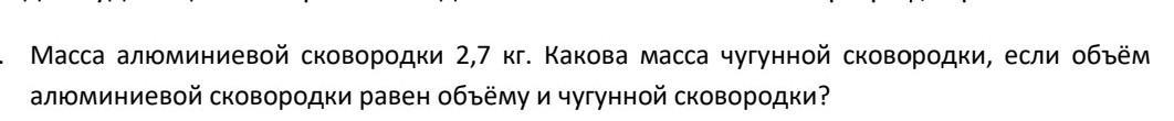 Для того, чтобы найти массу, надо воспользоваться формулами от плотности. Плотность равна массе, разделенной на объем. Для того, чтобы найти массу, надо плотность умножить на объем. А для объема надо массу делить на плотность. Плотность алюминия- 2,7 кг/м³, а чугуна-7,2 кг/м³. Сначала находим объем алюминиевой сковороды. Так как объем алюминиевой сковороды равен объему чугунной, то объем чугунной равен 1 м³. Далее по формулам находим массу и получаем массу сковороды.