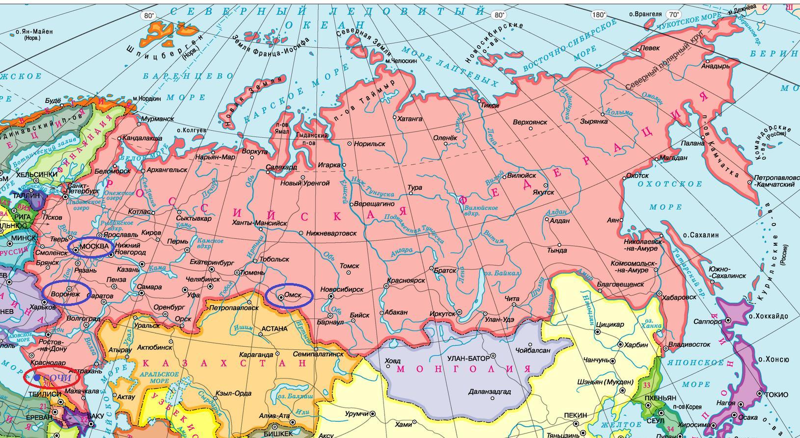 Из карта видно, что г.Сочи имеет координаты 43° с.ш., 39° в.д.