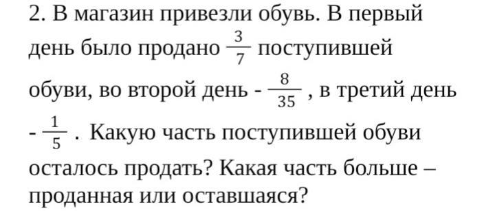 3/7+8/35+1/5=6/7 части всего продано за 3 дня, 1-6/7=7/7-6/7=1/7 часть осталось продать, 6/7>1/7 следовательно, продано больше, чем осталось