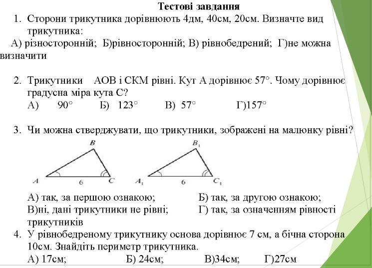 Перше фото: 1) 40 дм = 40 см, тож в трикутнику дві сторони однакової довжини, а тому трикутник рівнобедрений;