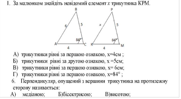 Друге фото: 1) Перша ознака: Якщо дві сторони й кут між ними одного трикутника дорівнюють відповідно двом сторонам і куту між ними другого трикутника, то такі трикутники рівні.