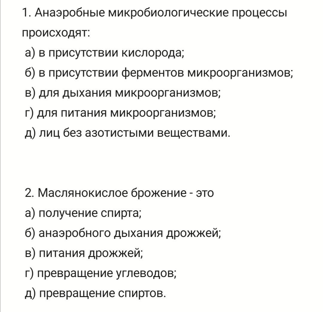 Процессы происходят с азотистыми веществами (вспомним про фиксацию азота), поэтому вариант д) тоже отпадает. А вот вариант г) нам важен, т.к раз микроорганизмы фиксируют молекулы азота включая ее в состав своей биомассы. Для анаэробного дыхания происходит биохимический процесс (окисление) слегка отличимый от микробиологического процесса брожения -биохимический процесс, основанный на окислительно-восстановительных превращениях органических соединений в анаэробных условиях. Поэтому ответ в) тоже подходит.