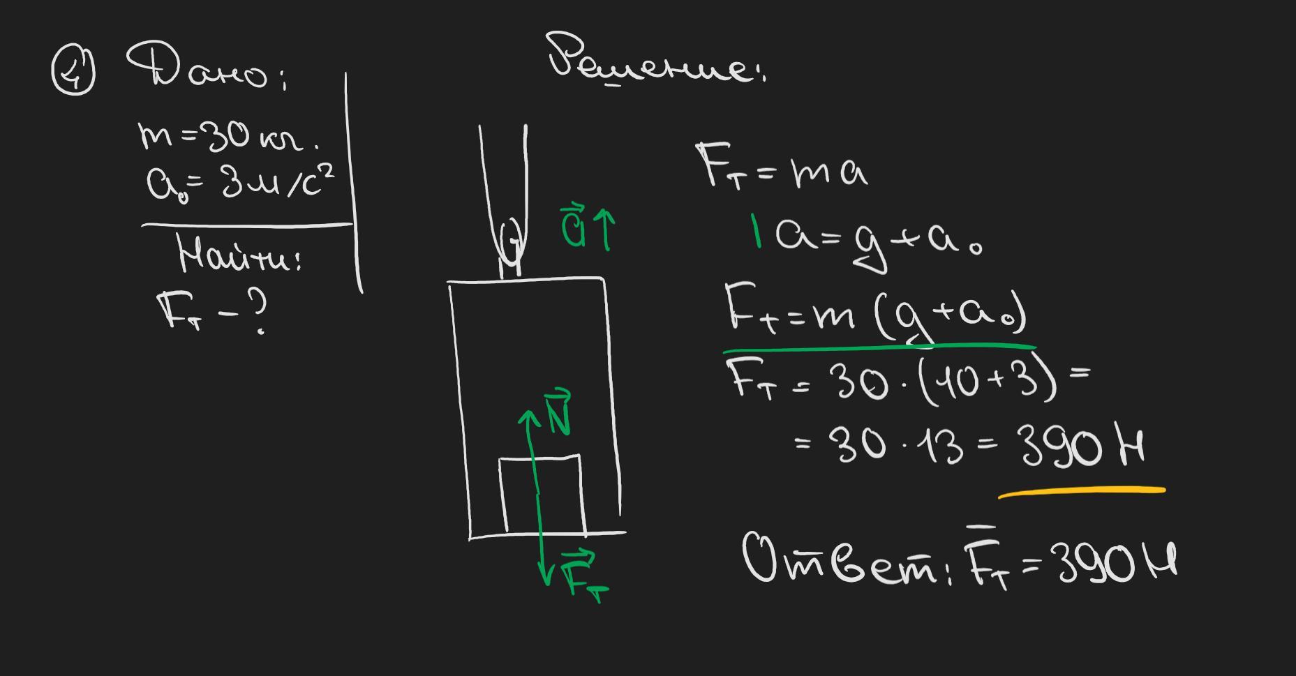 4. Груз массой 30 кг лежит на полу лифта, который движется вверх с ускорением а=3 м/с2. Найти вес тела.
