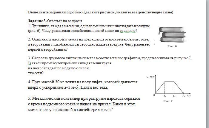 1. Три книги, каждая массой m, одновременно начинают падать в воздухе (рис. 6). Чему равна сила воздействия нижней книги на среднюю?