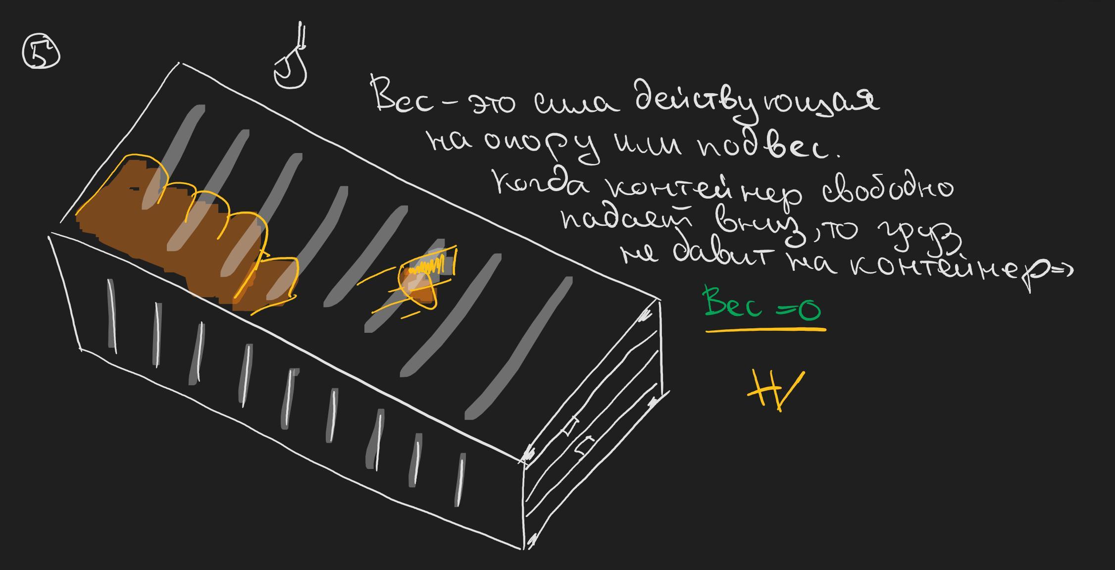 5. Металлический контейнер при разгрузке парохода сорвался с крюка подъемного крана и падает на причал. Каков в этот момент вес упакованной в контейнере мебели?