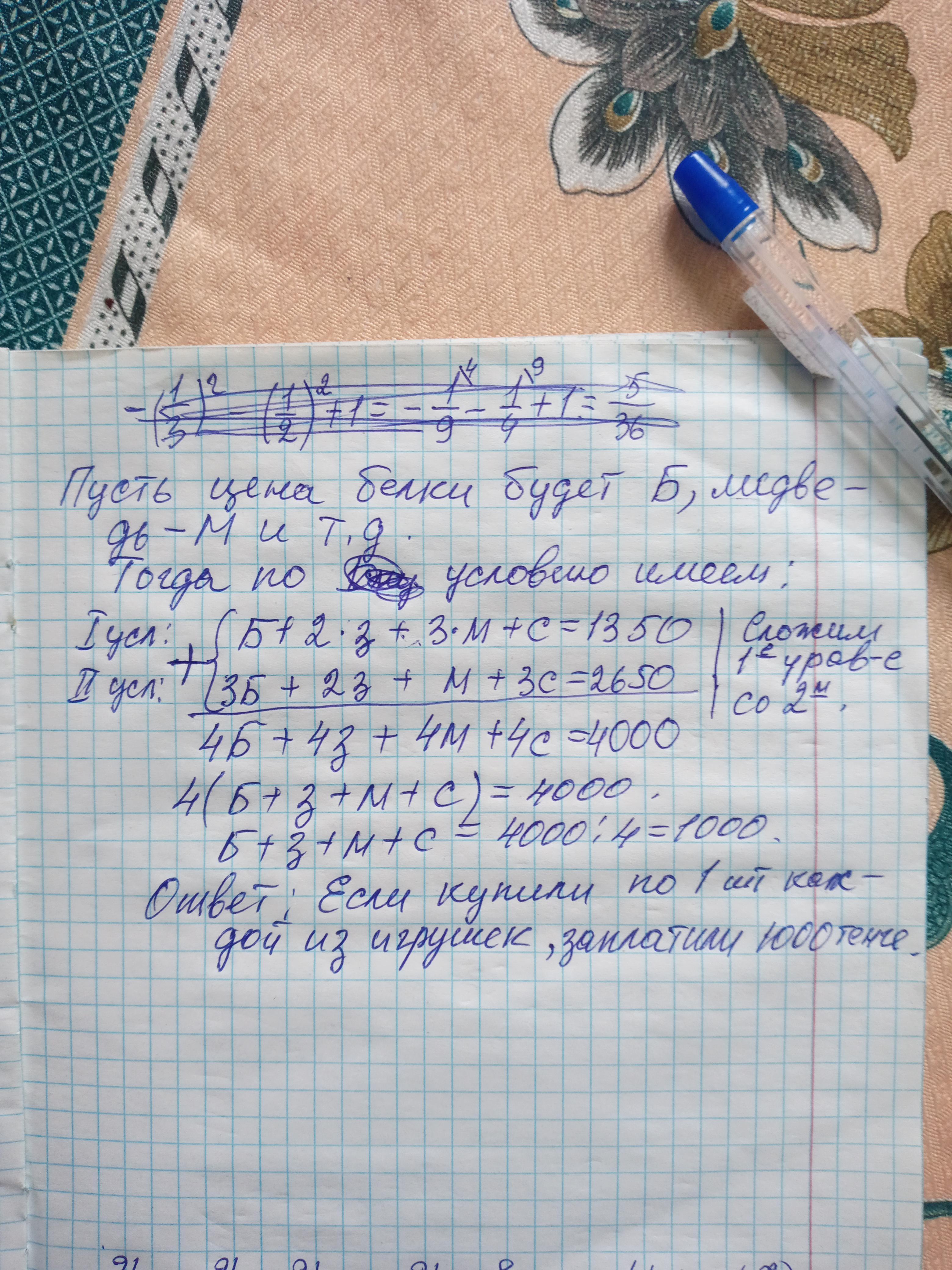 В детский сад купили игрушки белку, зайца, медведя и слона. Сколько заплатили за покупку, если белка, 2 зайца, 3 медведя, и слон вместе стоят 1350 тенге, а 3 белки, 2 зайца, медведь и три слона стоят 2650 тенге?