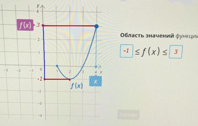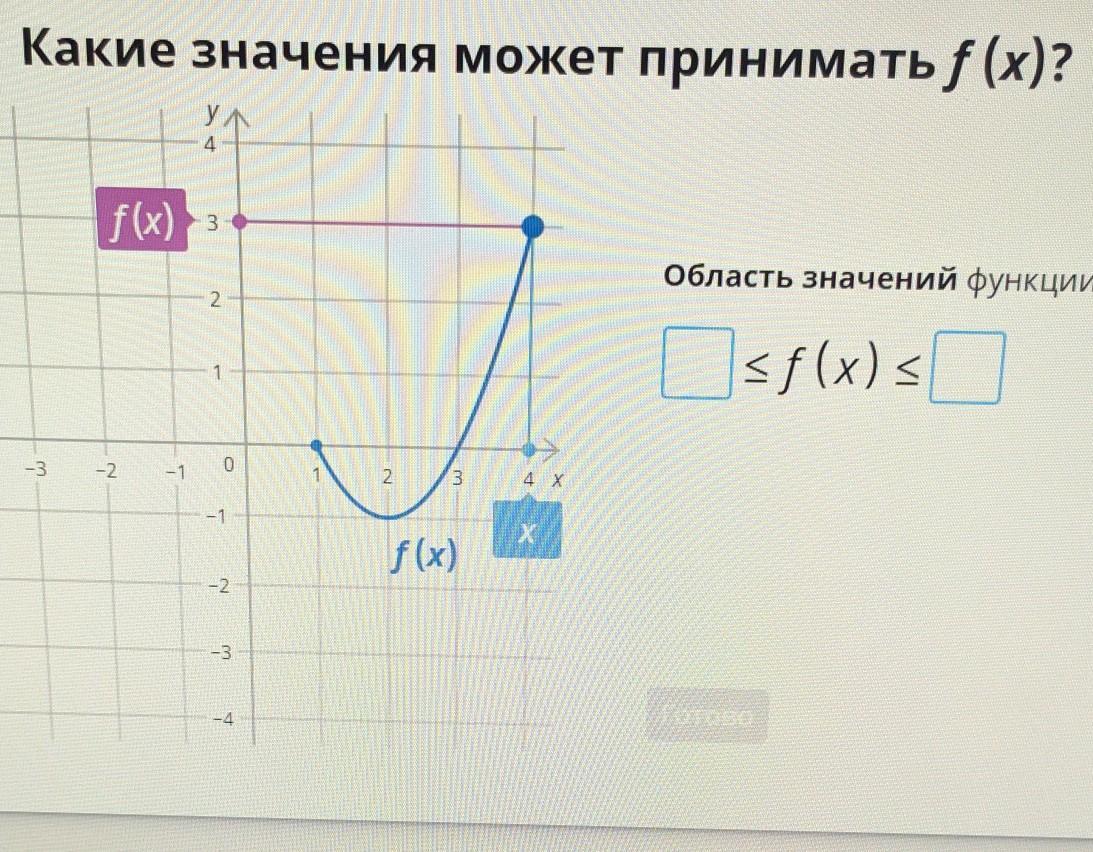 чтобы найти ,какие значения может принимать функция смотрим на самую низкую и самую высокую точки на графике. Самая низкая точка при х=2 . Функция опускается до значения -1. Самая высокая точка на правой границе функции при х=4 Функция равна 3.