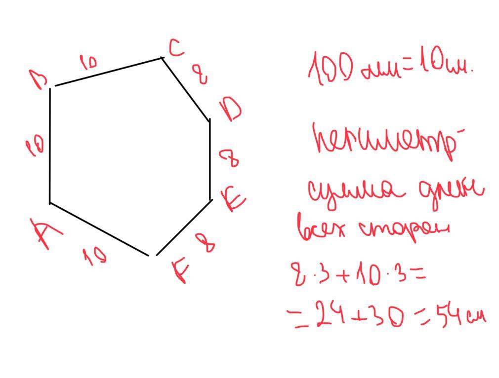 Вычислите периметр шестиугольника, три стороны которого по 8 см, а другие три - 100мм.