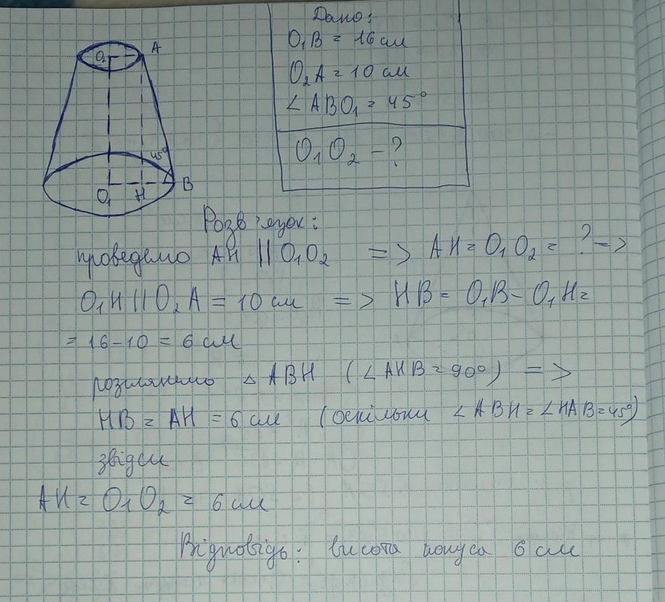 радіуси основ зрізаного конуса 10 і 16 см Знайдіть висоту конуса якщо твірна утворює з площиною більшої основи кут 45 °