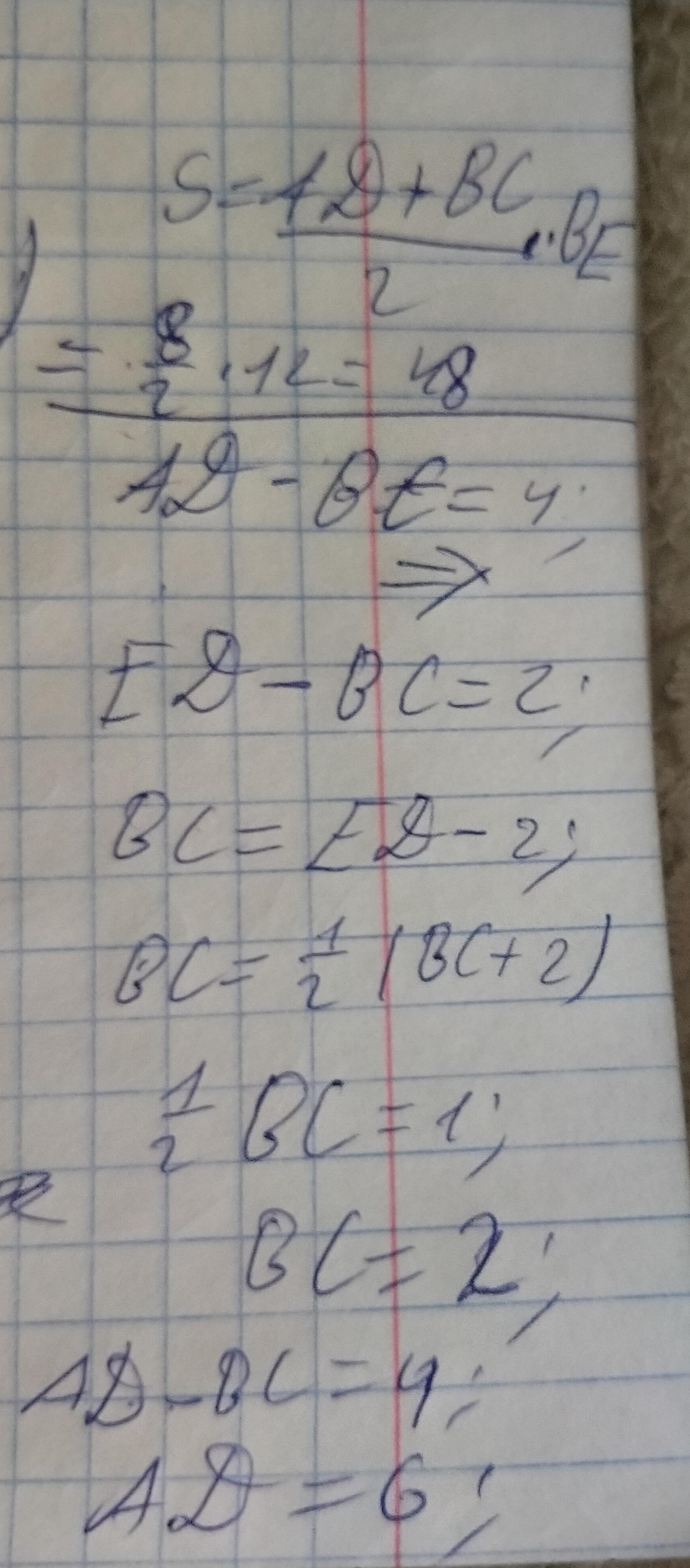 АД=2*3=6.; ВС=2. S=2(2+6)/2=2*8/2=8