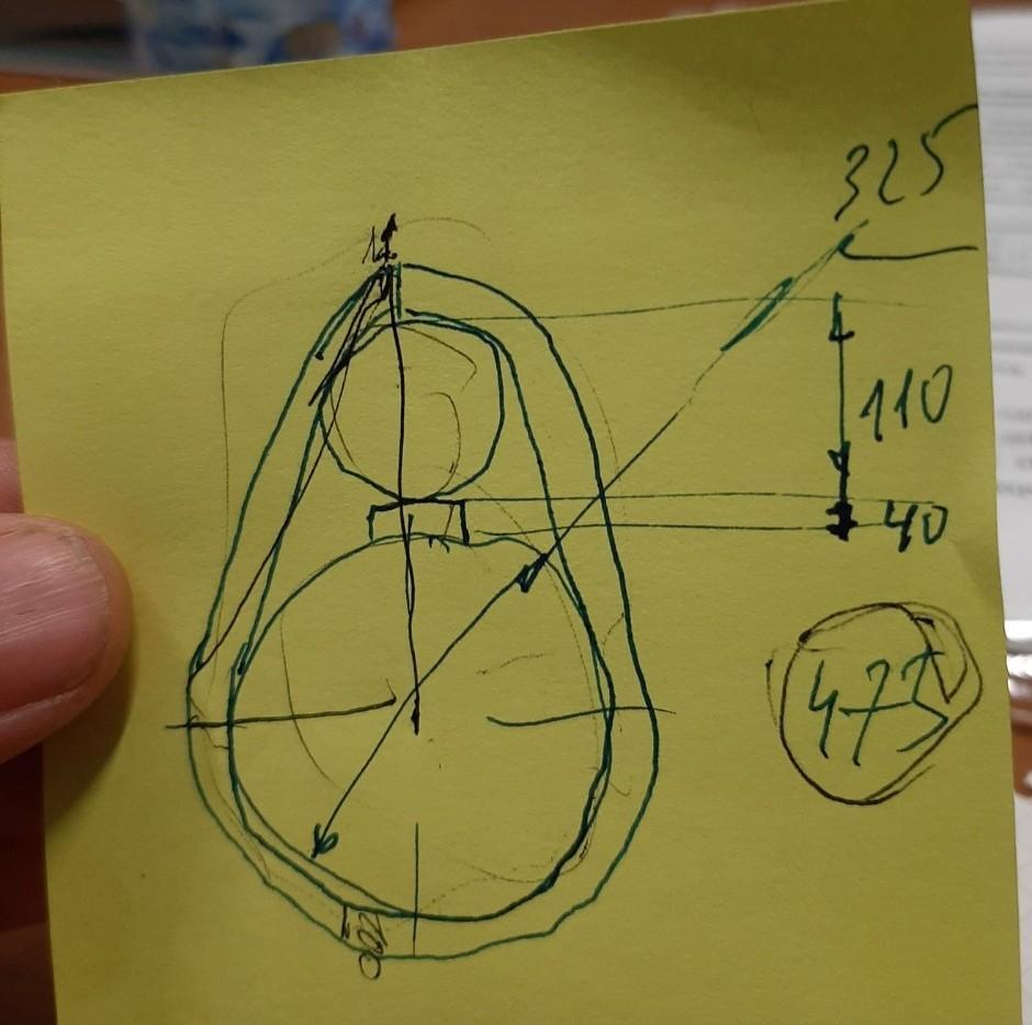 Два барабана и плоскость между ними образуют ременную передачу. Необходимо найти длинну этого ремня, исходя из следующих данных: D первого барабана равен 110мм, D второго барабана равен 325мм, плоскость между ними 40мм высотой. Высота всего механизма 475мм.