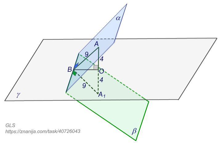 Грани α и β двугранного угла симметричны относительно плоскости симметрии γ. Известно, что точка находится в плоскости α на расстоянии 9 от ребра двугранного угла и на расстоянии 4 от плоскости симметрии γ.