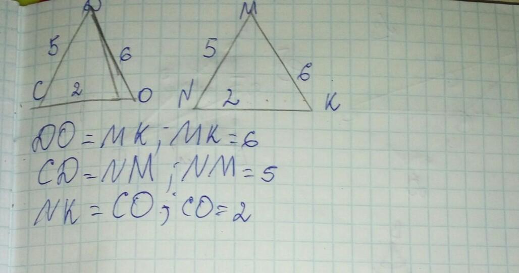 3. Трикутники CDO та NMK рівні. Відомо, що NK = 2 см, CD = 5 см, DO= 6 см. Зна-