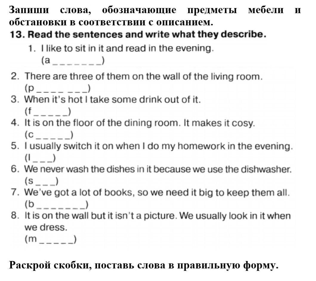 pictures- картины, Fridge - холодильник, carpet - ковер, lamp- лампа, sink- раковина, bookcase-стеллаж для книг, mirror -зеркало
