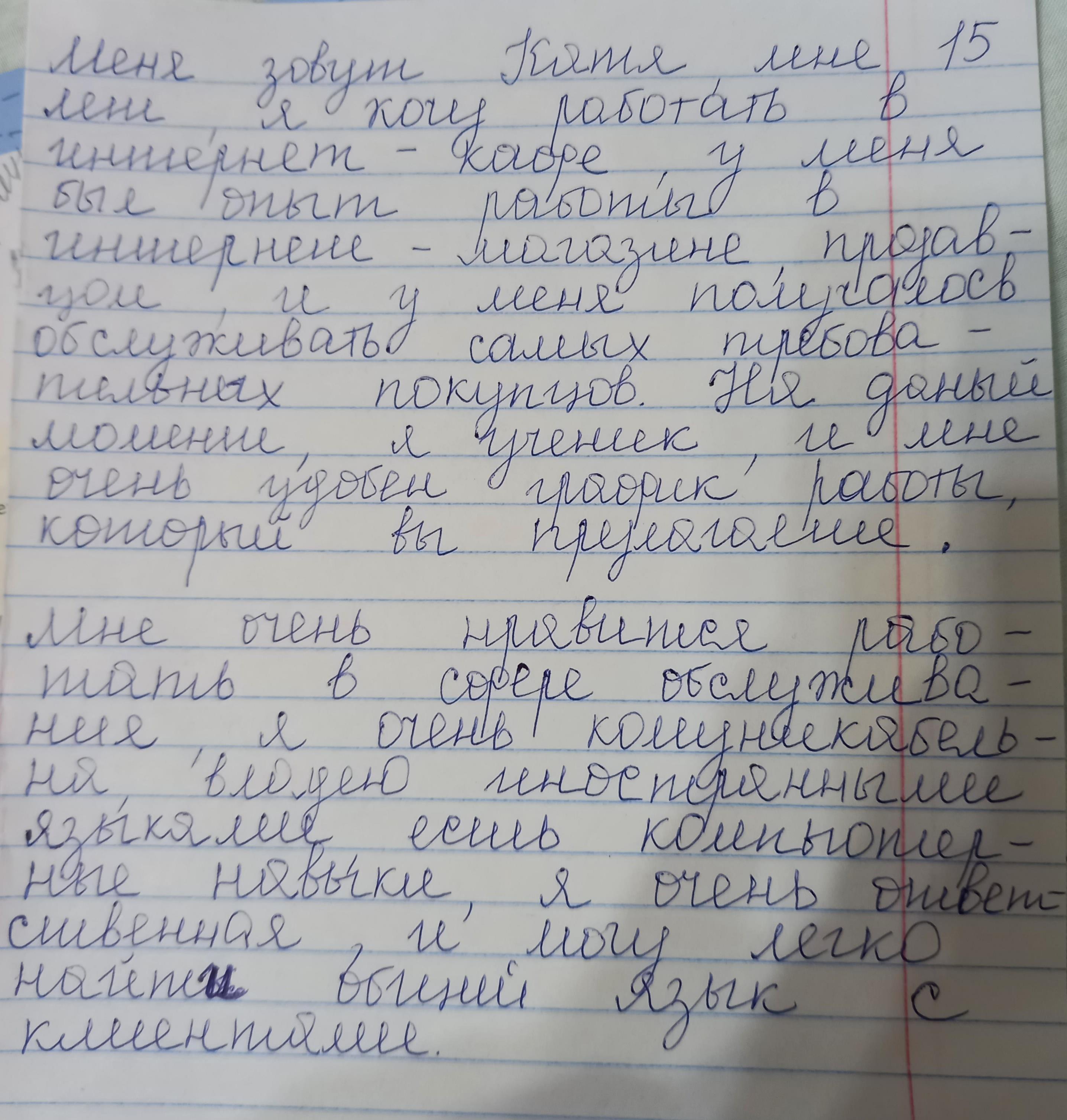 My name is Kate, I am 15 years old and I am a local resident. I have always desired to get a job like this, as I am confident I have all the necessary qualifications and skills related to the work of this kind. My previous work as a shop assistant in one of the stores in my street gave me a lot of experience, which I think will be important in the context of this job. I am a person who is responsible for the consequences of her actions and I always deal with my clients in a polite and attentive manner. I know how to deal with a most demanding client and I always try to satisfy the needs of a customer. I have good communication skills in English and French and I never stop practicing them whenever I get a chance.