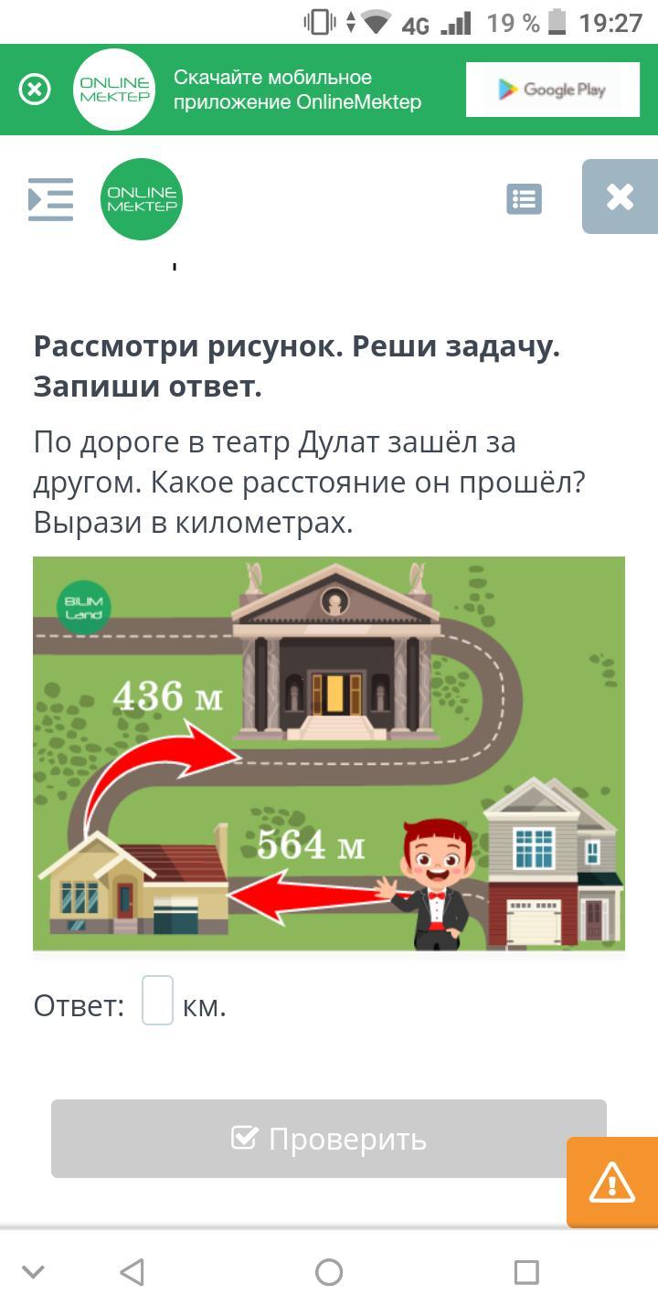 По дороге в театр Дулат зашёл за другом. Какое расстояние он прошёл? Вырази в километрах.
