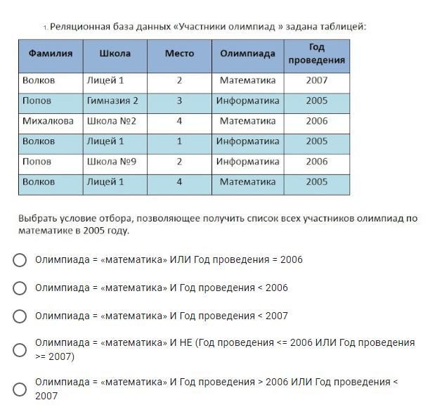2 вариант ответа Олимпиада = математика и Год проведения < 2006 , тюк меньше 2005 года не существует в этой таблице , но самым правильным запросом было бы