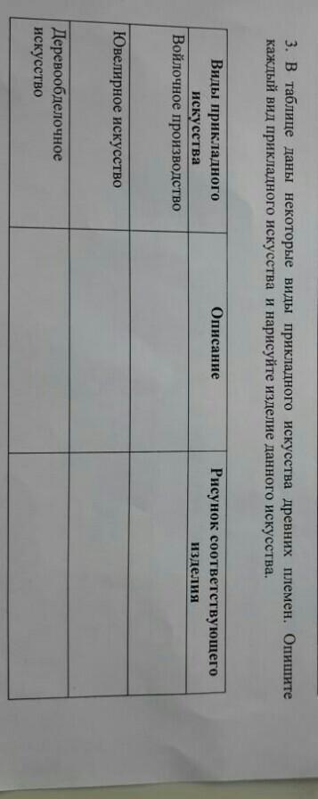 3. В таблице даны некоторые виды прикладного искусства древних племен. Опишите каждый вид прикладного искусства и нарисуйте изделие данного искусства.