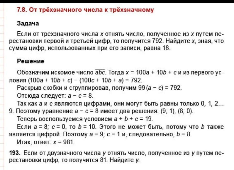 193. Если от двузначного числа у отнять число, полученное из у путём пе рестановки цифр, то получится 81. Найдите у.